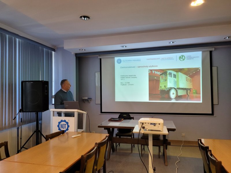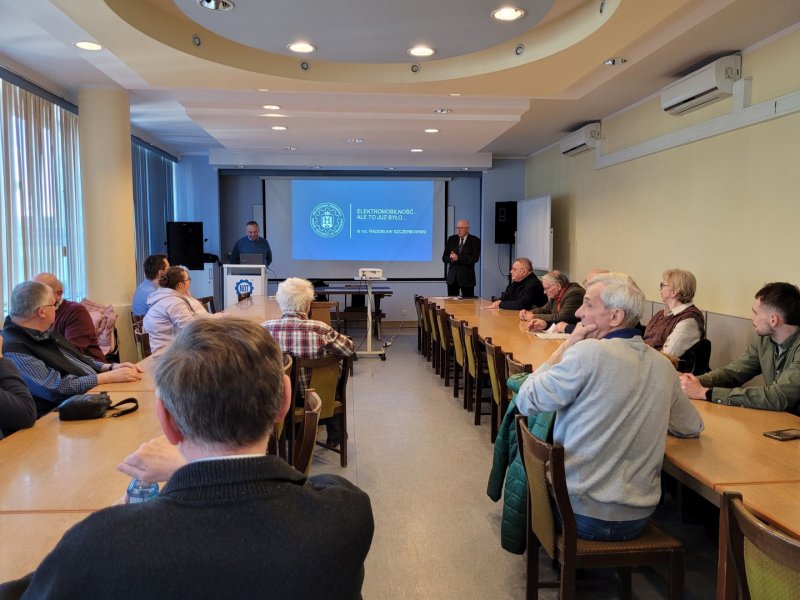 Podczas spotkania zwrócono uwagę na fakt, że pojazdy elektryczne nie są wynalazkiem XXI wieku – ich początki sięgają XIX wieku, kiedy to konkurowały one z pojazdami spalinowymi o dominację na rynku. Prowadzący przedstawił szereg przykładów historycznych konstrukcji oraz omówił przyczyny, dla których elektromobilność została na długi czas wyparta przez silniki spalinowe. Szczególnie interesującym elementem spotkania było zestawienie dawnych wyzwań z tymi, które obserwujemy obecnie. Uczestnicy mieli okazję dostrzec, że wiele problemów – takich jak zasięg pojazdów, czas ładowania czy dostępność infrastruktury – pozostaje aktualnych, choć współczesna technologia pozwala stopniowo je przezwyciężać. Dr inż. R. Szczerbowski podkreślił, że historia elektromobilności zatacza pewnego rodzaju koło, a obecnie pojazdy elektryczne przechodzą swojego rodzaju "renesans".