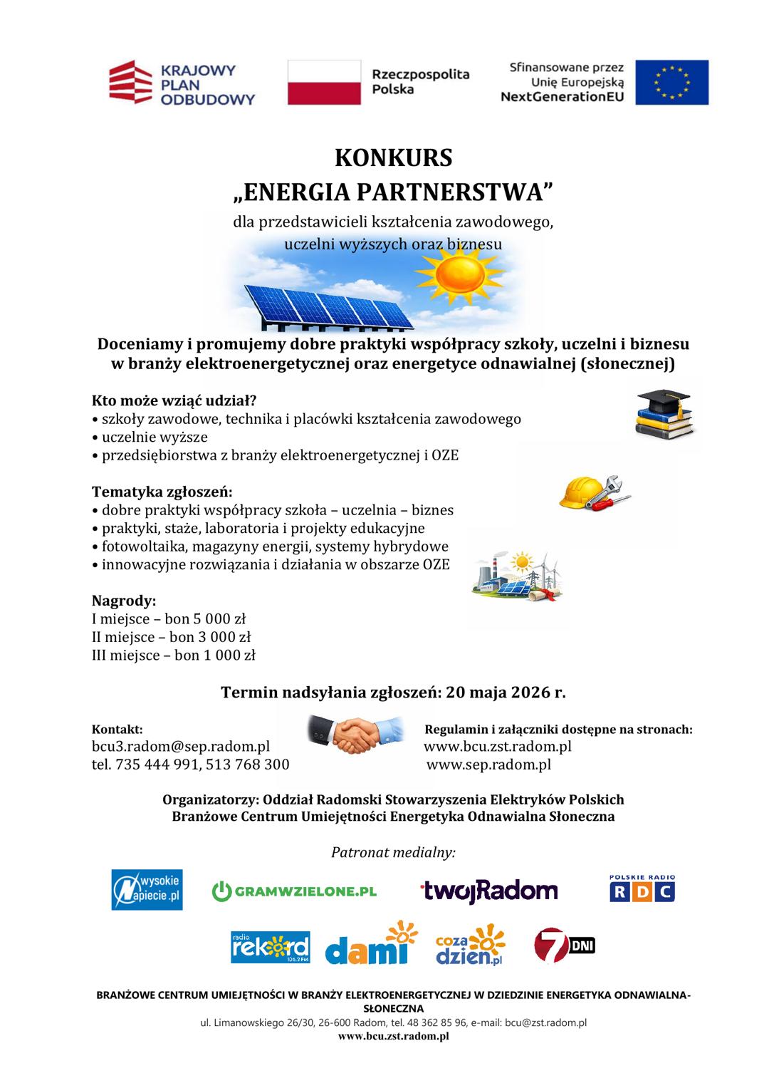 Branżowe Centrum Umiejętności nr 3 w Zespole Szkół Technicznych im. Tadeusza Kościuszki w Radomiu serdecznie zaprasza przedstawicieli kształcenia zawodowego, nauczycieli uczelni wyższych oraz przedstawicieli biznesu do udziału w konkursie promującym współpracę na rzecz rozwoju kompetencji i innowacji w sektorze energetyki odnawialnej. Konkurs realizowany jest w ramach projektu pn. „Utworzenie i wsparcie funkcjonowania Branżowego Centrum Umiejętności dla branży elektroenergetycznej w dziedzinie energetyka odnawialna (słoneczna)” w ramach Krajowego Planu Odbudowy i Zwiększania Odporności, w Komponencie A „Odporność i konkurencyjność gospodarki”, jako inwestycja A3.1.1 „Wsparcie rozwoju nowoczesnego kształcenia zawodowego, szkolnictwa wyższego oraz uczenia się przez całe życie”.